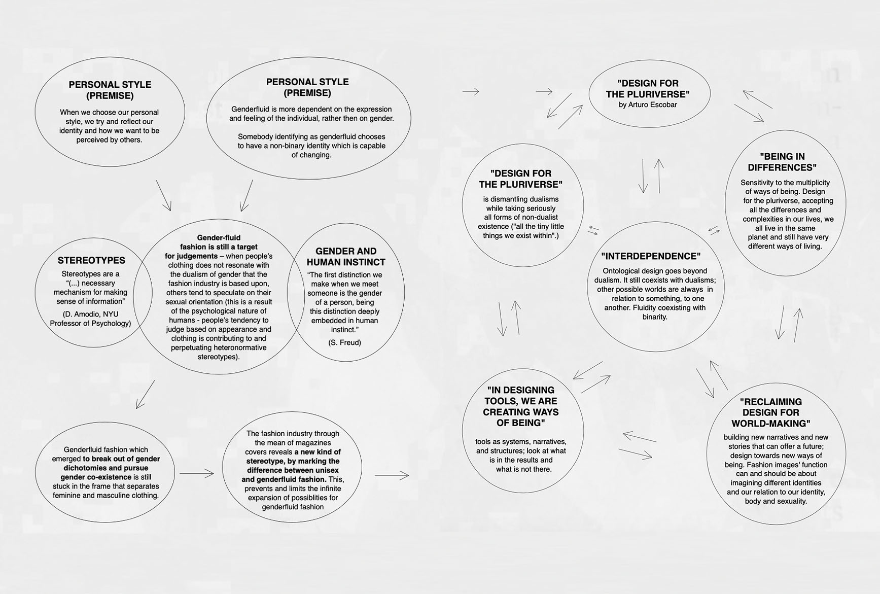 3 /4 The work comes from written and visual experiments undergone using auto ethnography as a tool. Auto ethnography explores subjectivity to challenge objectivity; it is a self-investigation and self-implication into the research, it values the emotional as containing different levels of knowledge. The starting research question for this project is: how does the depiction of gender fluidity in fashion magazines, aimed at the co–existence of gender, distort the original goal and reveal a new kind of stereotype?