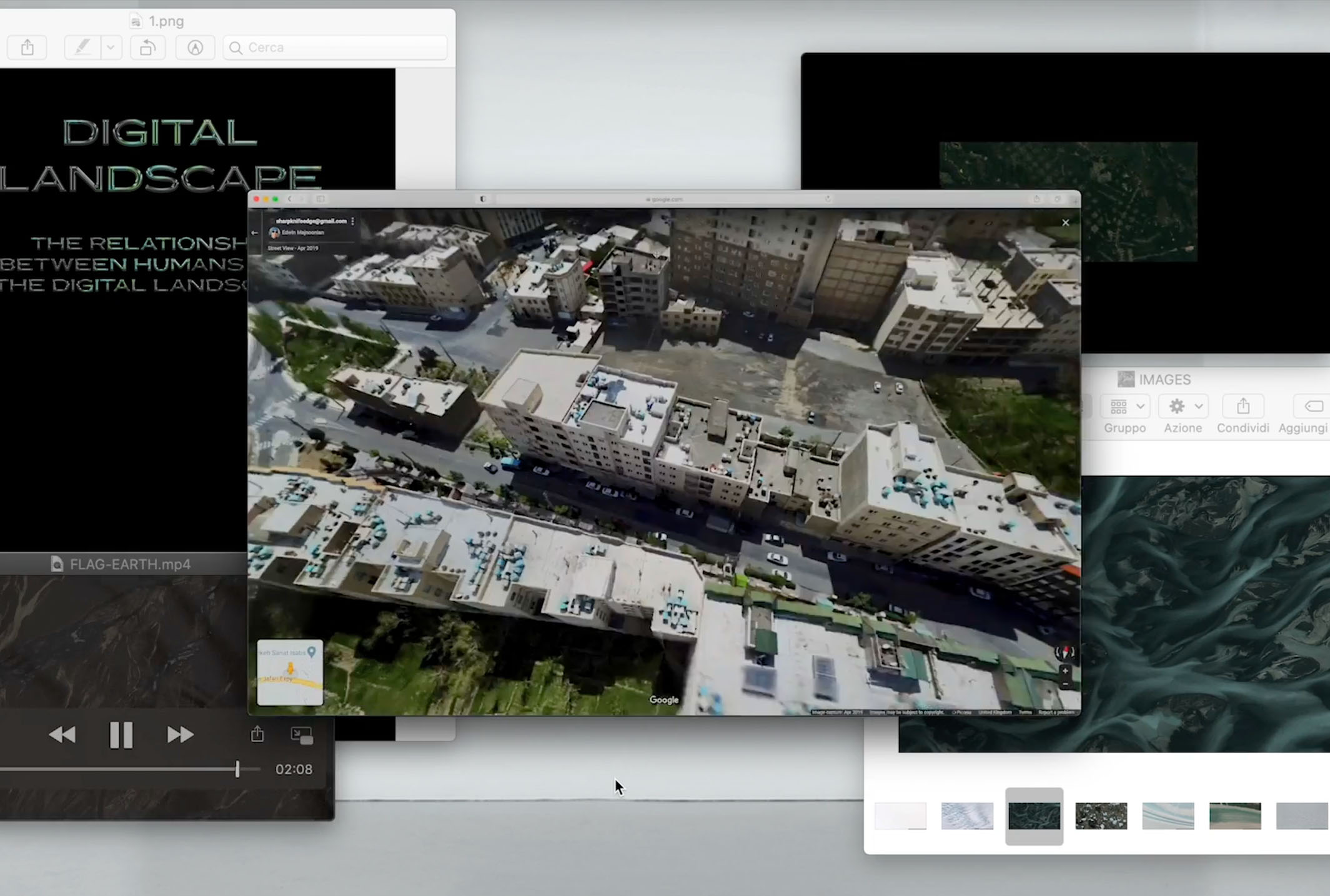 4 /5 The images files document Google softwares and are empirical when researching how far human presence has propagated, specifically through the implementation of digital technologies. More in detail, inside the folder are four other subfolders, respectively containing: the welcome text; a .PNG file with a poster of the Shelley sonnet; a folder containing an .MP3 file of the poem and an experimental song by Naomi Chan; the fourth folder contains some open-source screenshots of the Earth captured using Google softwares; lastly, the videos folder contains a time-lapse recorded using Google Earth and a video using Google Street View. Alongside this last one, is an intense sound as a background; two experimental videos; two videos overlaying the flag pattern, while the very last video represents the little Google Maps falling man. This last one conceptualises the fall of mankind facing nature. The statue of the destroyed Ramssei The II appears in one video, implicitly representing the fall of humanity.