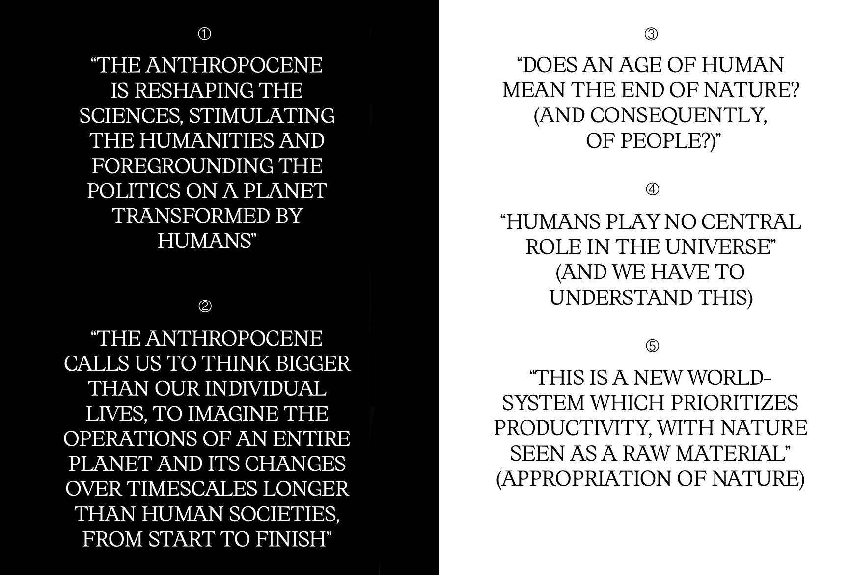 1 /5 This project investigates the following macro-areas: the relationship between human-environment and the notion of adaptation in the Anthropocene. The book that constituted the main catalyst to the research is The Age of the Earthquakes by Douglas Coupland, Hans Ulrich Obrist and Shumon Basar, which aims at discussing data and its impact on the planet, consequently questioning the way we live and exist in the world today.