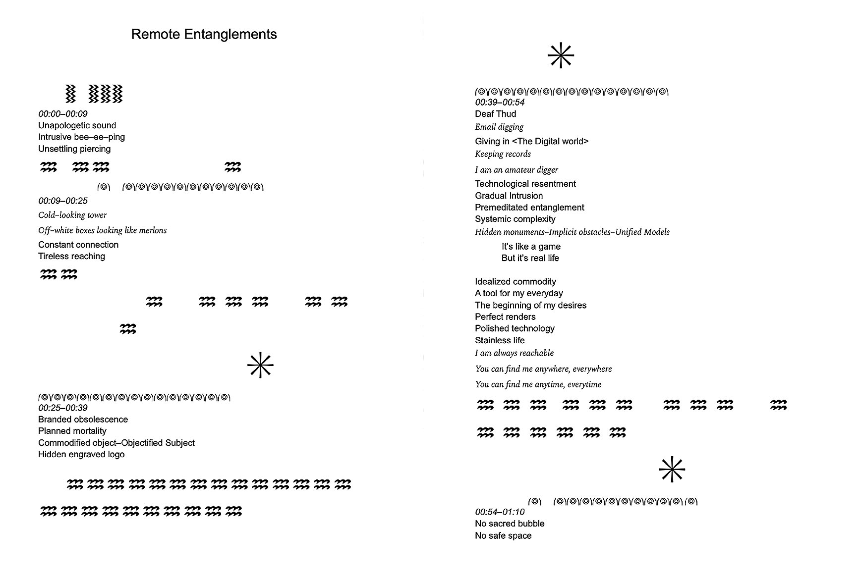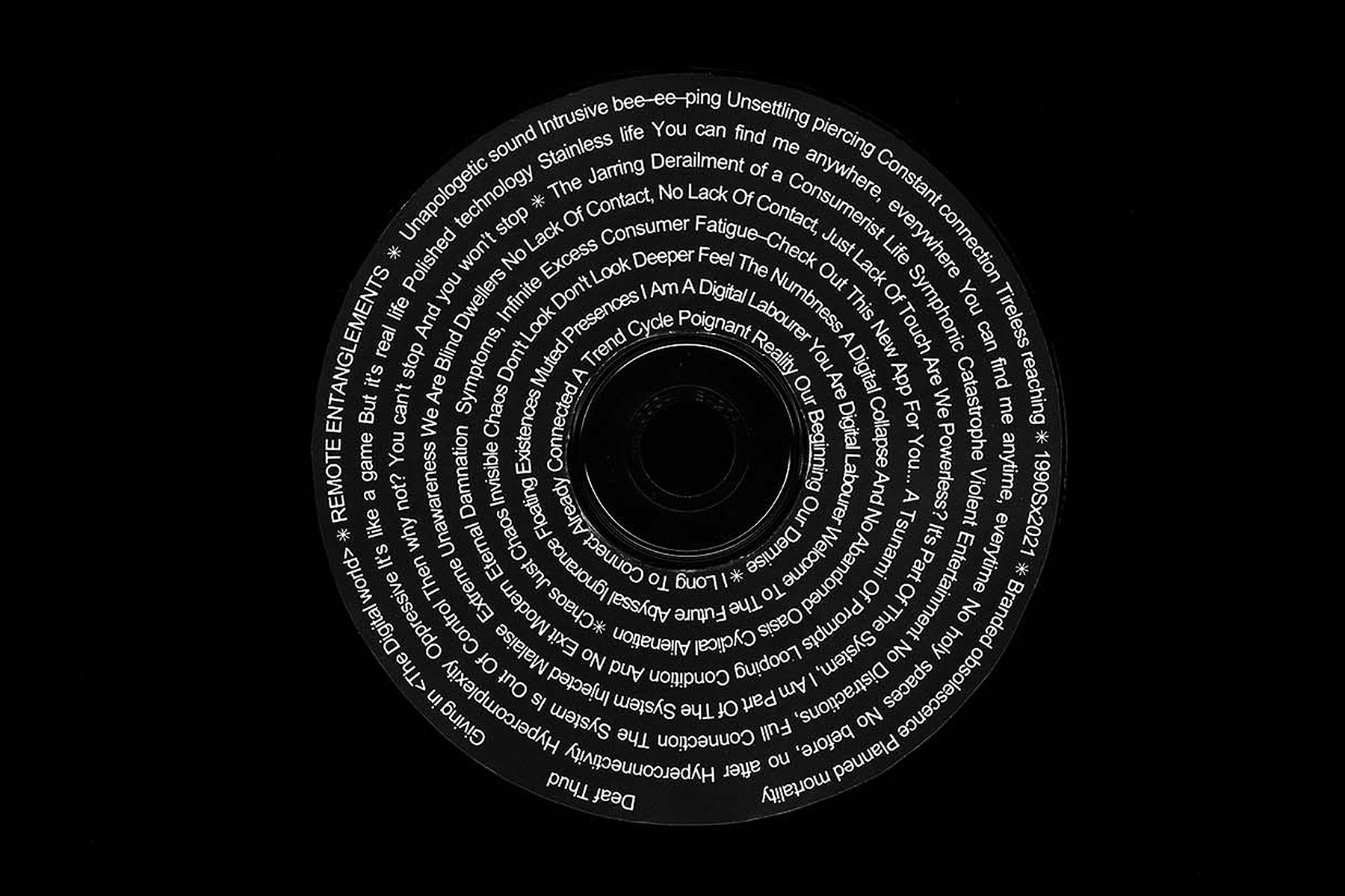 4 /5 Considering the method of refiguring {Allahyari, M. 2020}, the research outruns the typical scope of graphic design, by uniting different presences {texts, sounds and film} into one space to recreate a nostalgic idiosyncratic mood. The piece addresses a public curious about the systemic and colonial trait of digital technologies, and anyone interested in the preservation of the visual lexicon of consumer ephemera. Remote Entanglements generates critical discourse that discards pessimistic beliefs on technology, and rather interrogates it as an exploited tool. Here is the link with the content of the CD ::︎ SOUNDCLOUD::